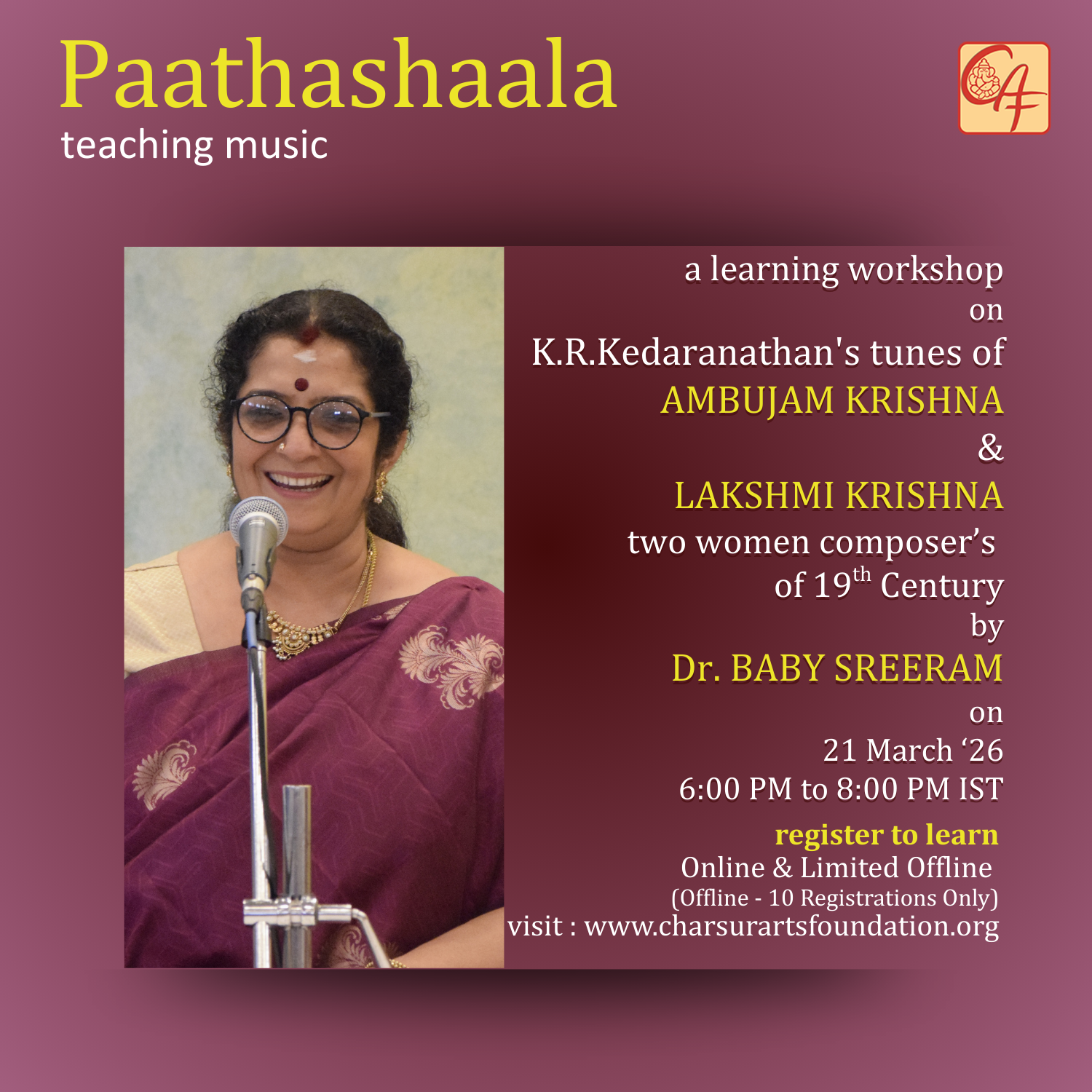 Charsur Arts Foundation works with well known artistes, gurus, Vidwan's/ Vidushi's and Musicologists to impart lessons to students of Carnatic music through workshops, events and talks. Register for the upcoming workshop.