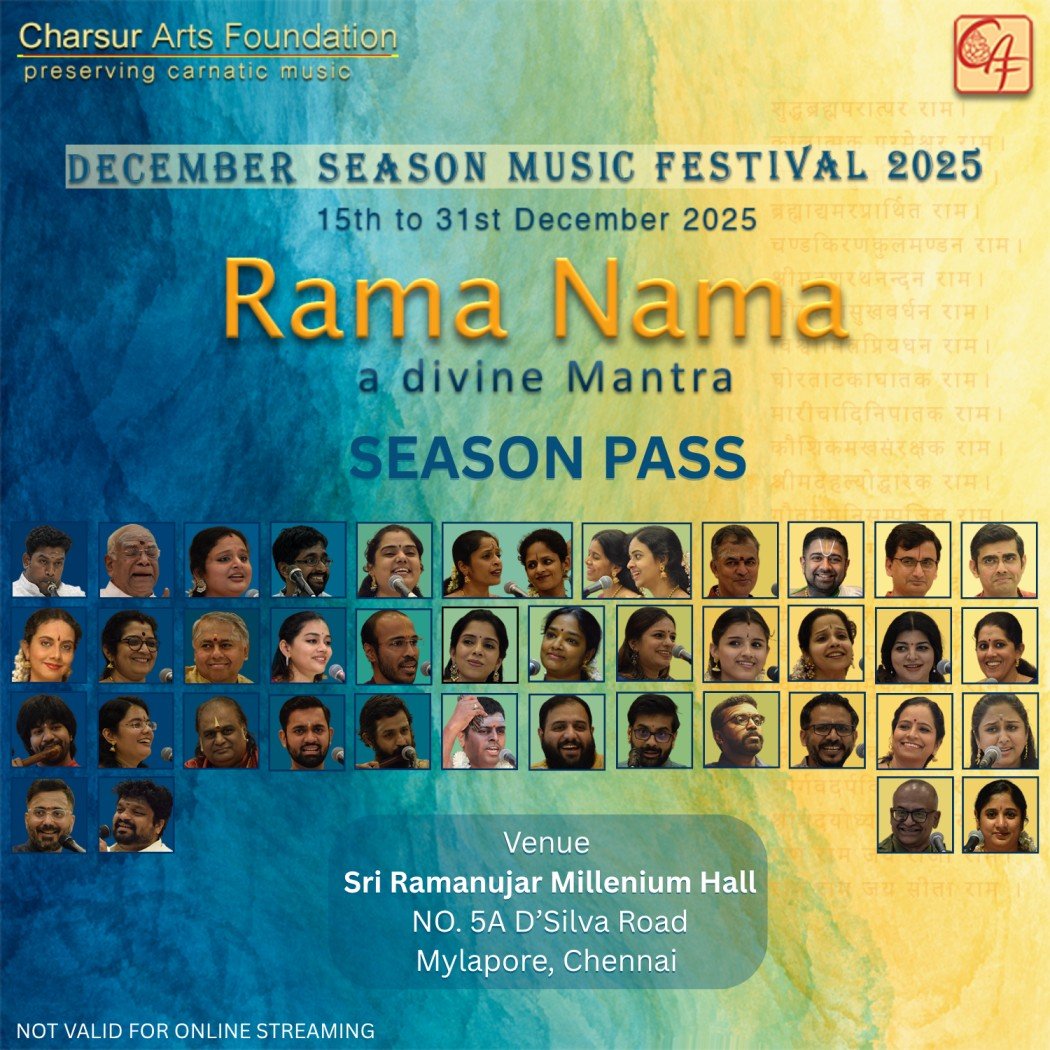Charsur Arts Foundation proudly presents the December Season Music Festival 2025 — a 17-day celebration of Carnatic music and devotion, themed “Rama Nama – A Divine Mantra.”