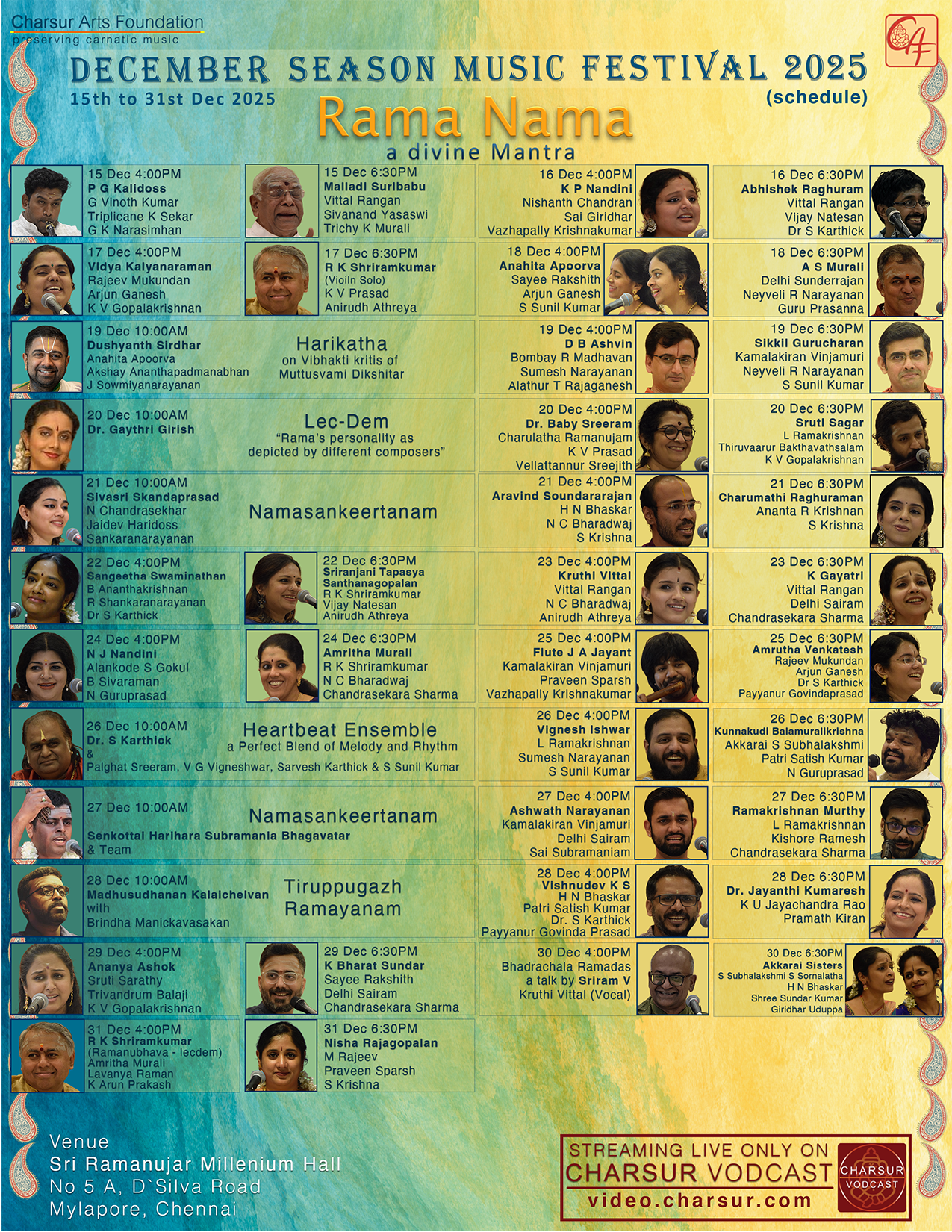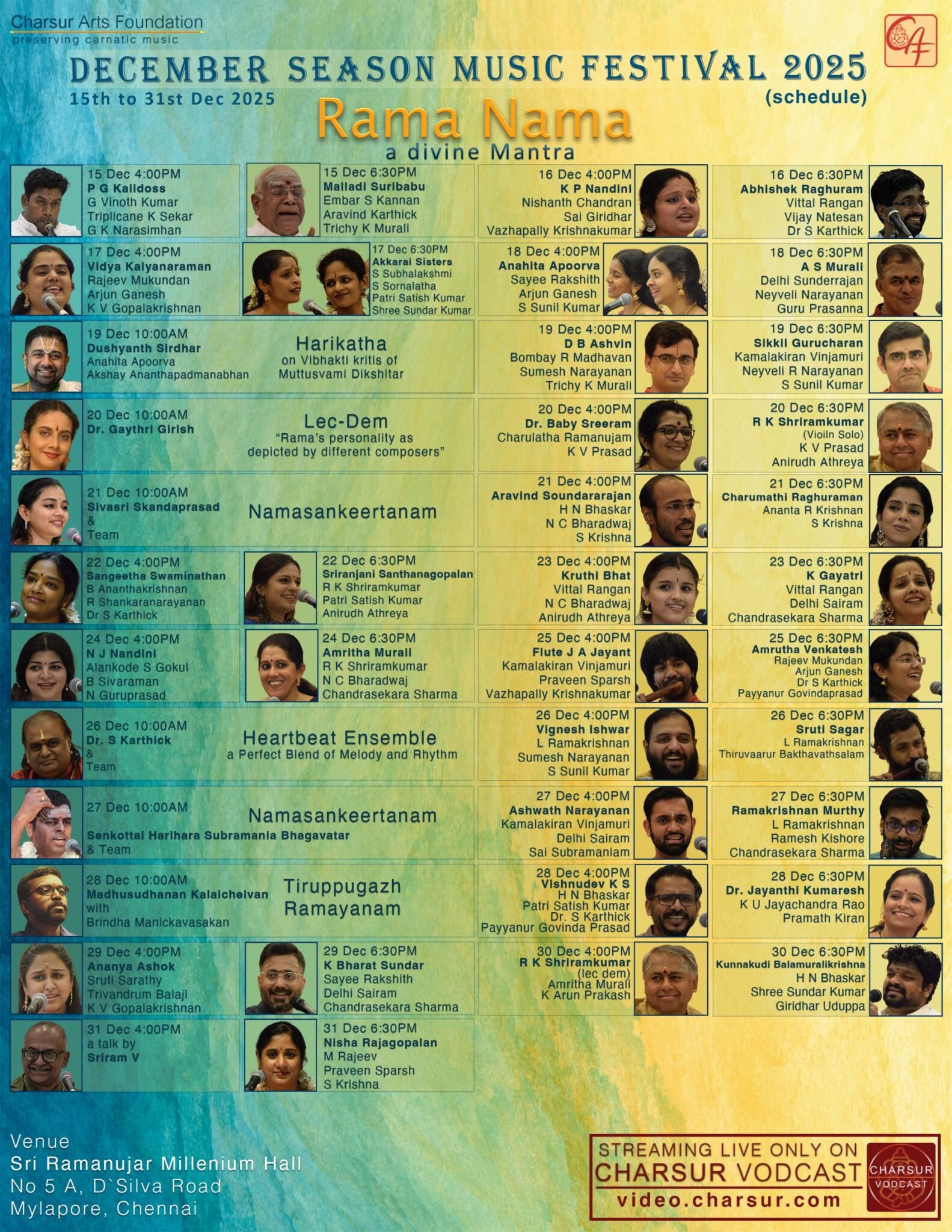 Charsur Arts Foundation proudly presents the December Season Music Festival 2025 — a 17-day celebration of Carnatic music and devotion, themed “Rama Nama – A Divine Mantra.”